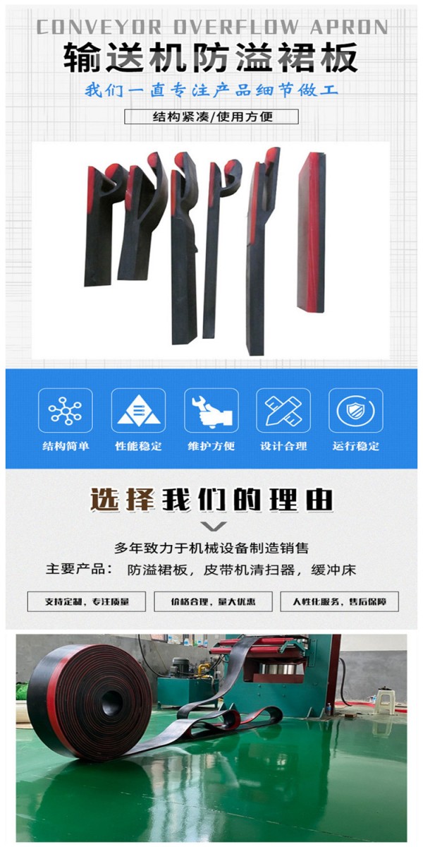 防溢裙板用于輸送帶與導料槽之間密封和緩沖床與導料槽之間的密封,安裝主要是:蝶形螺母式和手柄式兩種方法,直接安裝在皮帶機導料槽的下沿。