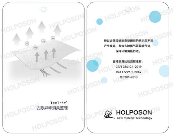 HOLPOSON? Hulk 是我司東華大學(xué)博士團(tuán)隊(duì)開發(fā)的紡織品消臭整理劑,能夠有效吸附氨、硫化氫、三甲胺、甲基硫醇以及苯酚,氧化氮、醛類等有刺激氣味的臭氣,具有良好的凈化異味氣體功能,為適用人群營(yíng)造舒適清新安全的生活環(huán)境。消臭整理劑HOLPOSON? Hulk可以在滌綸,棉,粘膠及混紡織物后整理工藝添加,適用于:家紡、服裝、地毯、窗簾、襪子、車內(nèi)飾等領(lǐng)域。