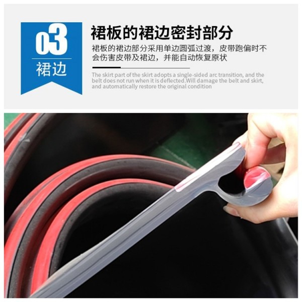 雙層防護防溢裙板,導料槽密封系統,Y型固定膠塊,裙邊主體采用一次性一體熱硫化方式制成,結構緊湊有效,結實。背面的型固定膠塊可根據客戶要求在制作的過程中去掉,以適應過去老的安裝。