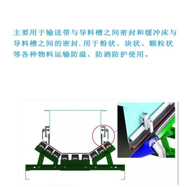 2、防溢裙板高度可根據導料槽的實際尺寸適當調整。采用了橡膠添加半凝固潤滑劑的方式,解決了以往防溢裙邊高的同時,容易損傷皮帶的難題。該材質質地柔韌,彈性優良,避免了聚氨酯(PU)不耐水的缺點,高的同時不損傷輸送帶。