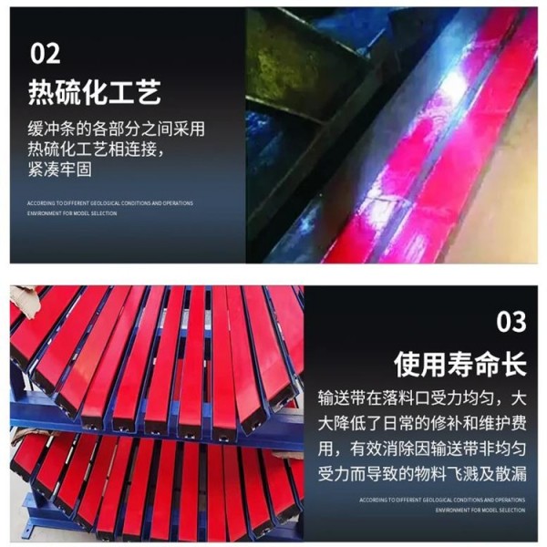 緩沖條是用于輸送機的進料口處,替代傳統的緩沖托輥,高能吸收和低摩擦地緩解進料端落料的沖擊力,輸送條和輸送帶的面接觸有效防止了對輸送帶的損傷。