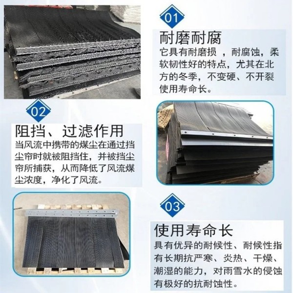 6mm橡膠擋塵簾通常由直徑6mm的橡膠條制成,具有良好的彈性、耐磨性和耐高溫性能。此外,擋塵簾還具有阻擋、過(guò)濾作用,可以有效地降低風(fēng)流煤塵濃度,凈化風(fēng)流。同時(shí),擋塵簾前安裝的凈化噴霧裝置,可以使被擋塵簾捕獲的煤塵變得濕潤(rùn),然后沖洗流至巷道底板,成為不浮游的沉積煤塵。