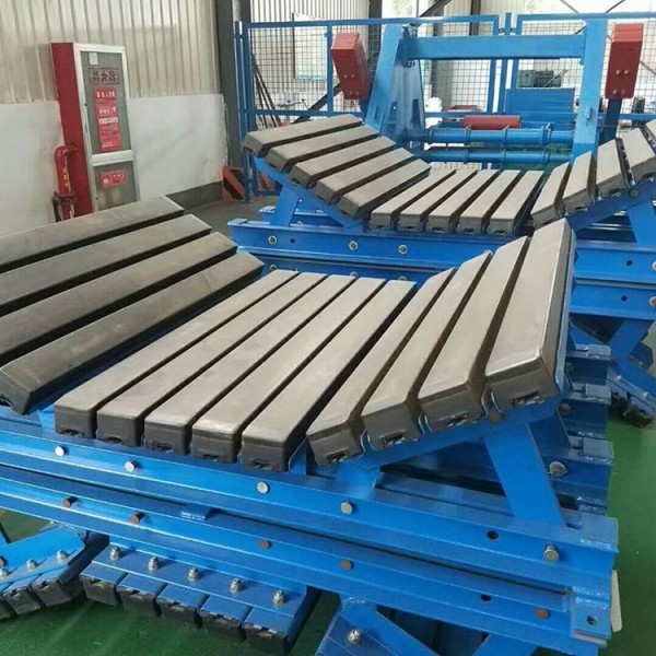 緩沖床作為緩沖托輥的替代產物,緩沖床上緩沖條與皮帶面與面的接觸,為帶式輸送機落料點提供全面的支撐。在落料點使用緩沖床可與導料槽配套結合使用,防止了落料點飛濺及散落。
