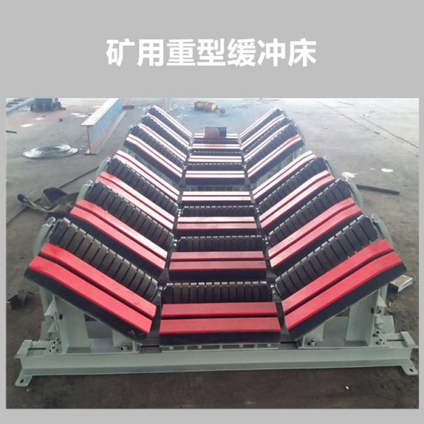 工礦條件較為不好,如落料高,物重大,密度大時,常規緩沖床無法滿足需求,這時可選用重型緩沖床或彈簧式緩沖床。重型緩沖床是緩沖托輥與緩沖床的組合體,結合二者優點,提供面與面接觸的同時保證皮帶機順滑通過。